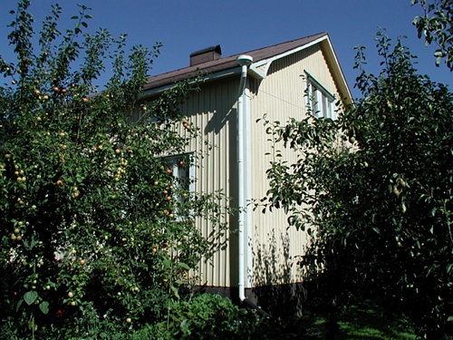 Piharakennuksessa on sauna ja varastotilaa sekä länsipäässä autotalli. Rakennuksen ulkovuoraus on uusittu. Vesikaton kate on uusittu peltikatteeksi joitakin vuosia sitten. Kapean tontin hyvin hoidetulla takapihalla on pieni leikkimökki ja kasvihuone. (2002) |